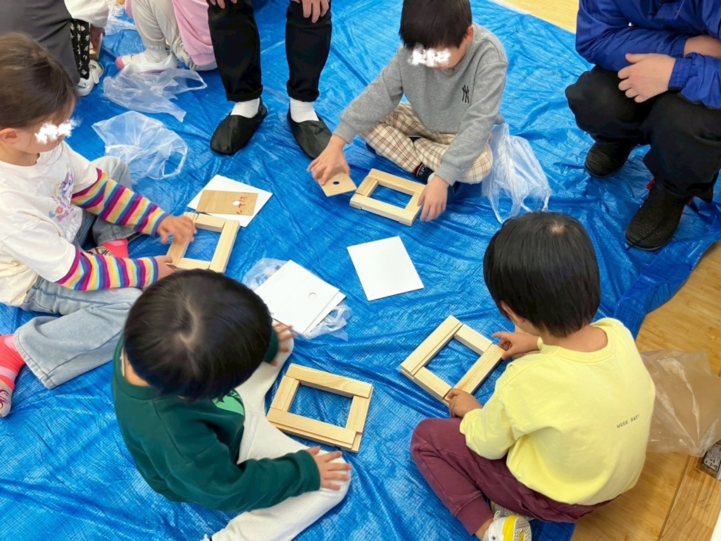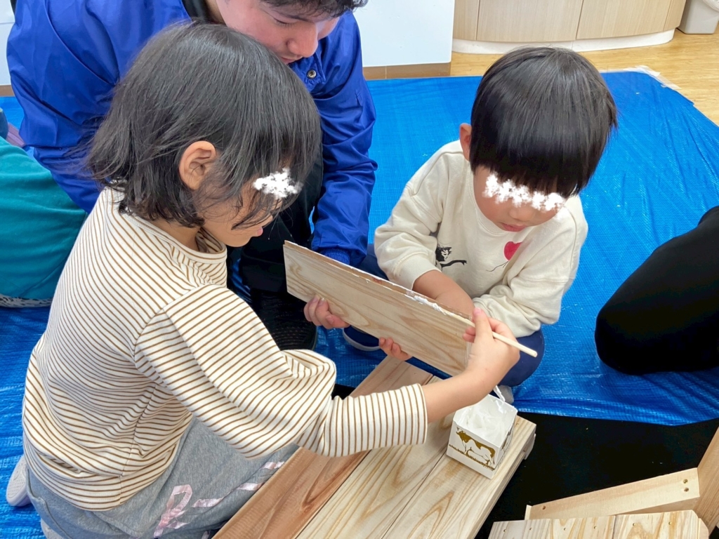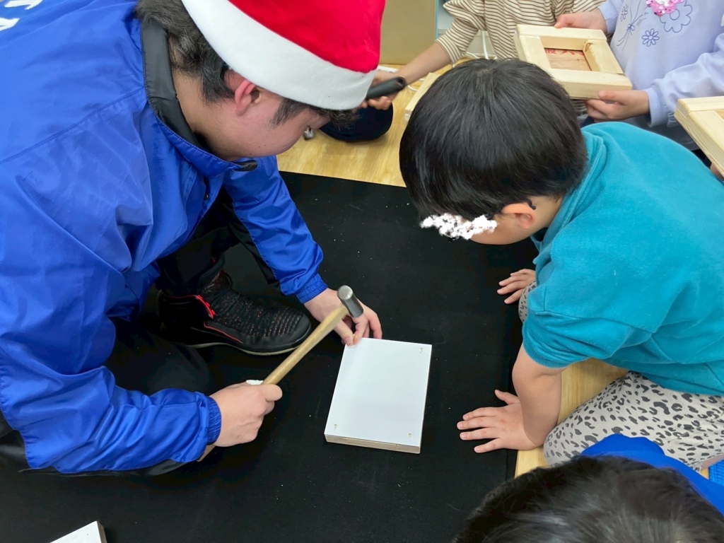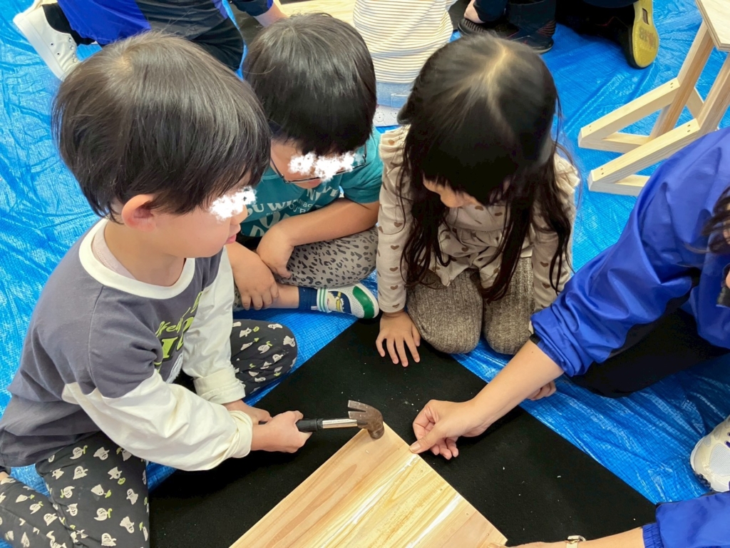 釘打ちをする工程もあり、初めての体験にドキドキしながらも、スタッフの方や保育者と一緒に、集中して取り組む子どもたち。