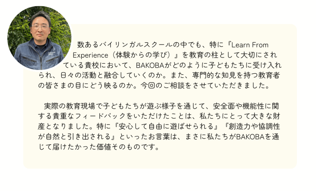 その一環として、YBS(横須賀バイリンガルスクール)とララランド戸塚第2園の保育現場で、実際に子どもたちがBAKOBAで遊ぶ様子をもとに、保育者が専門的な視点から玩具に関するフィードバックを行うという取り組みが実現しました。